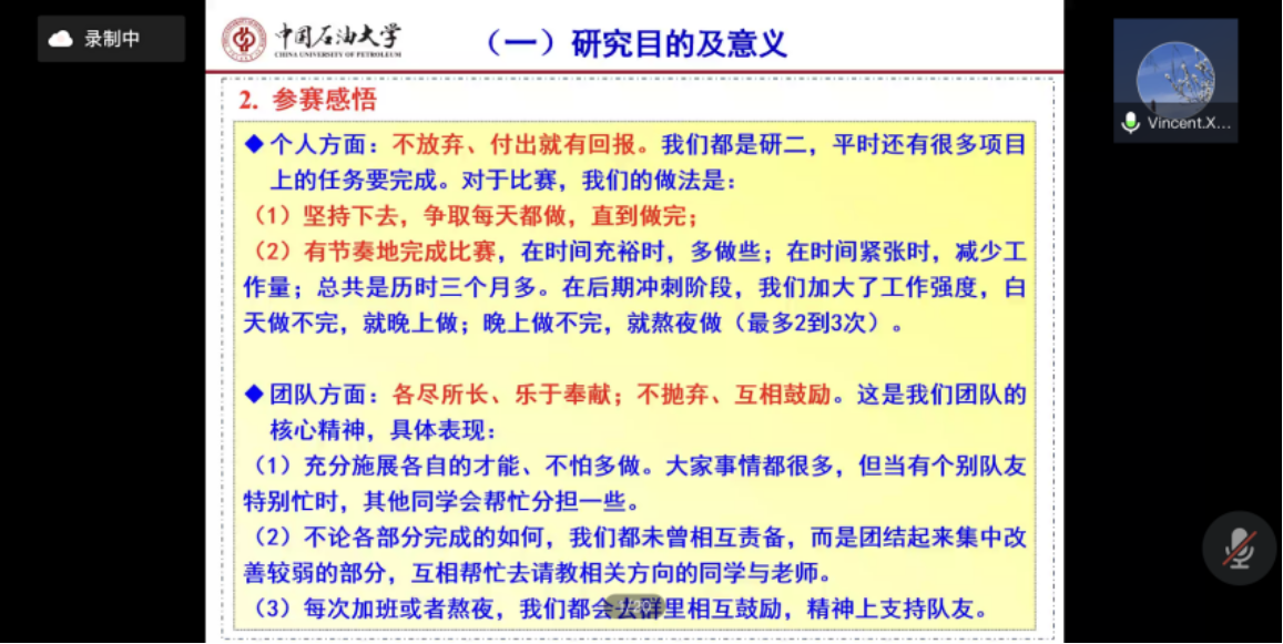 在往屆參賽選手經(jīng)驗(yàn)分享階段,曾獲得第四屆油氣地質(zhì)大賽研究生綜合組特等獎(jiǎng)的張興文和彭思橋為大家進(jìn)行了參賽指點(diǎn)。張興**調(diào),整場(chǎng)比賽可分為兩段進(jìn)行,第一步首先完成整體框架,然后第二部分補(bǔ)上短板,突出團(tuán)隊(duì)核心亮點(diǎn)。這也是關(guān)鍵所在;彭思橋?qū)⒊练e相分析部分比賽的各個(gè)階段分別進(jìn)行剖析,并強(qiáng)調(diào)文獻(xiàn)調(diào)研方面要注意查找相關(guān)資料,同時(shí)也給大家推薦了經(jīng)典文獻(xiàn),希望大家從中能夠有所啟發(fā)。兩位學(xué)長(zhǎng)在分享的最后階段也不忘給了本次即將參賽的選手加油打氣,希望全體參賽選手能夠有節(jié)奏地完成比賽,發(fā)揮團(tuán)隊(duì)優(yōu)勢(shì),各盡所長(zhǎng),互相鼓勵(lì),最終順利拿下比賽。