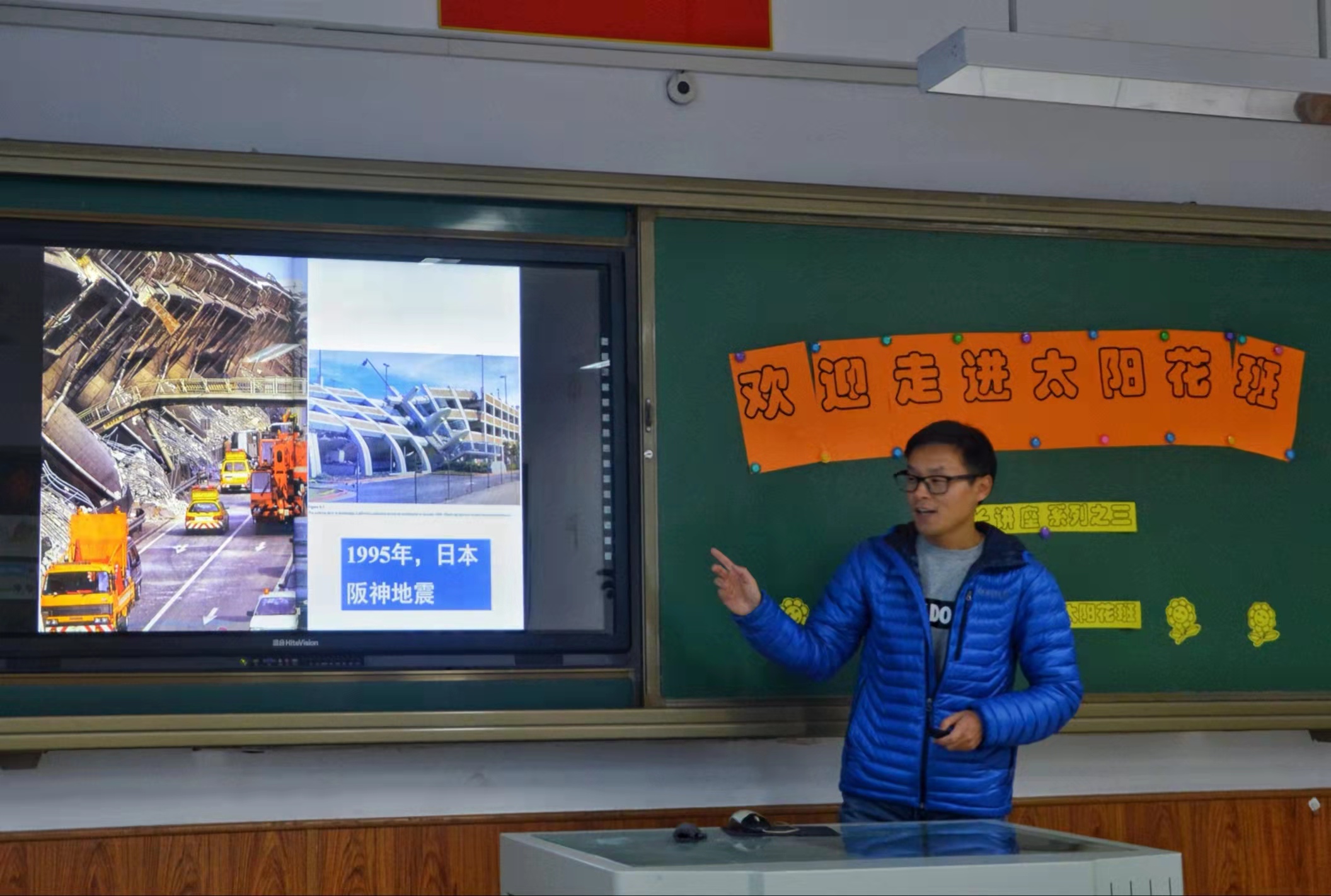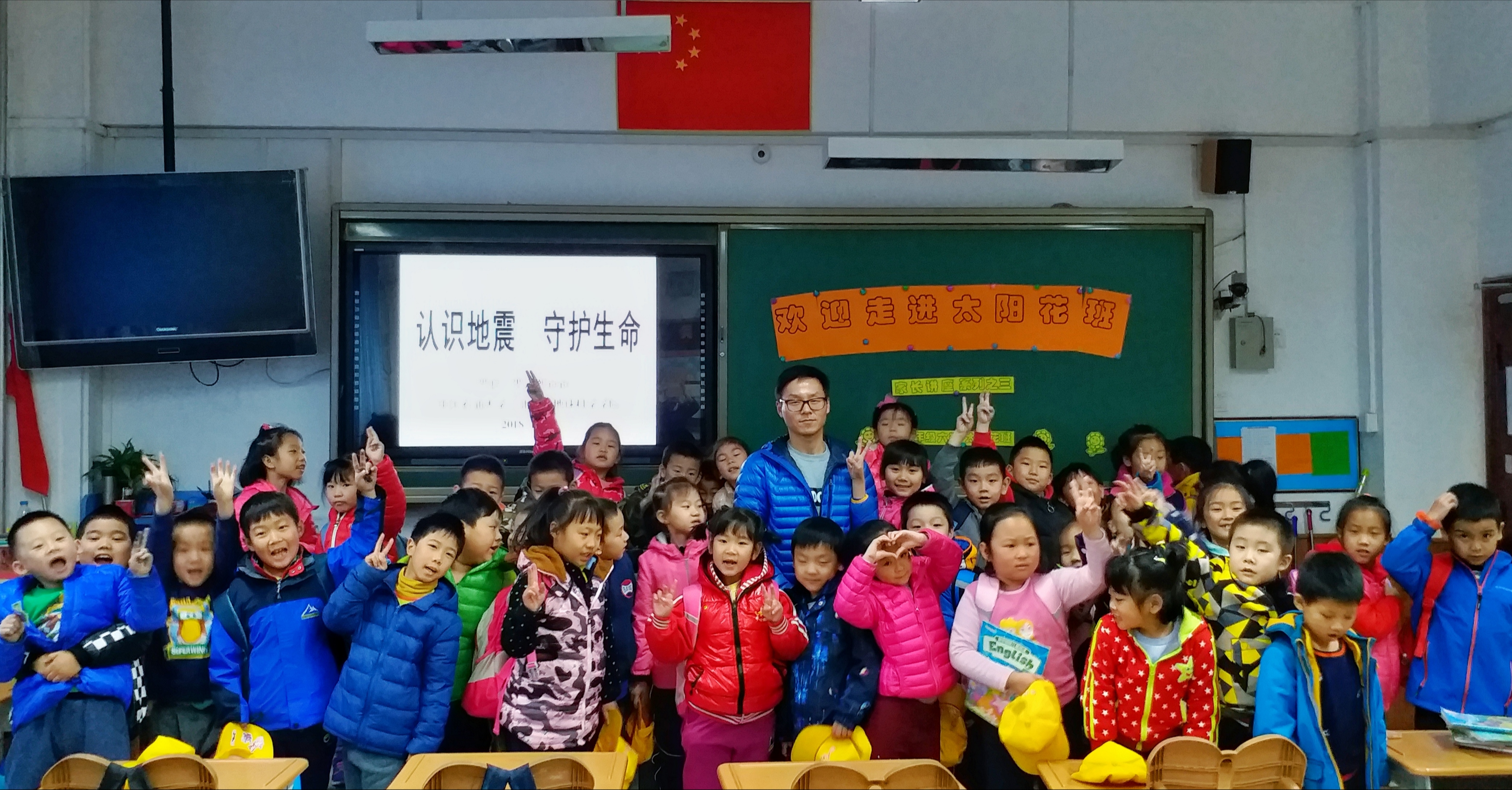 “我們能夠生活在這美麗的藍色地球上,是無比幸福的,因為這里有高山、有海洋、有陽光、有鮮花,還有可愛的小動物們。但是,地球經過幾十億年的演化,有著復雜的地質結構,它有時候也會發泄“小脾氣”——地震。你們了解地震嗎?我們又該如何在地震來臨時保護好自己呢?”講堂伊始拋出兩個問題,讓學生們對此產生了濃厚的興趣及引起積極的思考。接著羅澤熙爸爸用簡單的語言及生動的視頻詮釋了什么是地震?地球就像是一個能量球,它的內部緩慢積累的能量突然釋放就會引起地球表面的震動,震源深度淺、震級高的地震會給人類帶來很大的傷害。