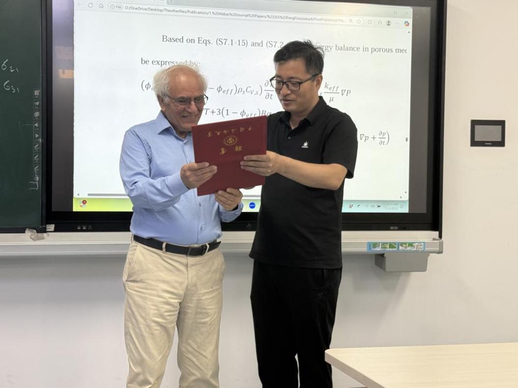 課程尾聲迎來歷史性時刻,石油工程學院宋先知院長和人事處劉悅副處長代表學校向Firoozabadi教授頒發了榮譽教授聘書,標志著校方與國際頂尖學者的深度合作正式啟動。宋院長致辭說:“您三天來的傾囊相授,展現了熱力學在能源領域的永恒價值。”劉處長也強調:“這份聘書不僅是儀式象征,還是連接國際創新成果與中國能源戰略的橋梁。”Firoozabadi教授回應稱期待與中國石油大學(北京)共同探索熱力學研究的新思路新方向。此次聘任不僅是對Firoozabadi教授個人的崇高敬意,更是我校推進國際化戰略、建設“雙一流”學科的關鍵一步。