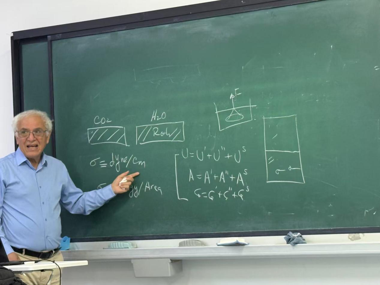 報告廳內,Firoozabadi教授系統闡釋了體相與界面熱力學及其在地下流體流動與熱能開采中的應用理論體系。首日課程聚焦熱力學基礎與相態演化,Firoozabadi教授通過嚴謹的公式推導,結合《油氣藏熱力學》教材和相關學術論文,解析重力場與毛細管力場耦合作用下的三相平衡機制。次日課程深入工程實踐核心,Firoozabadi教授以狀態方程為例,強調閃蒸計算在碳封存設計中的關鍵作用,并同步關聯教材內容強化理解。第三日課程轉向學科前沿,Firoozabadi教授通過相場法動態模型展示裂縫擴展機理,揭示界面張力與線張力對壓裂液行為的控制規律。而Hossein Hejazi教授的壓軸報告呈現了重油開采技術突破,通過高溫高壓微觀實驗影像,直觀展示高溫乳化劑誘導的原位油包水乳液在巖石孔隙中的流動特性,結合界面流變學數據定量解析剪切應力對液滴斷裂的調控機制,為重油開采提供了全新解決方案。課程間隙的每一次提問都化作學術交鋒的閃電,各位同學和老師各抒己見,相繼提出自己的疑問,而教授們也在耐心回答,不僅解開了同學們的疑惑,更啟發了新的研究思路。