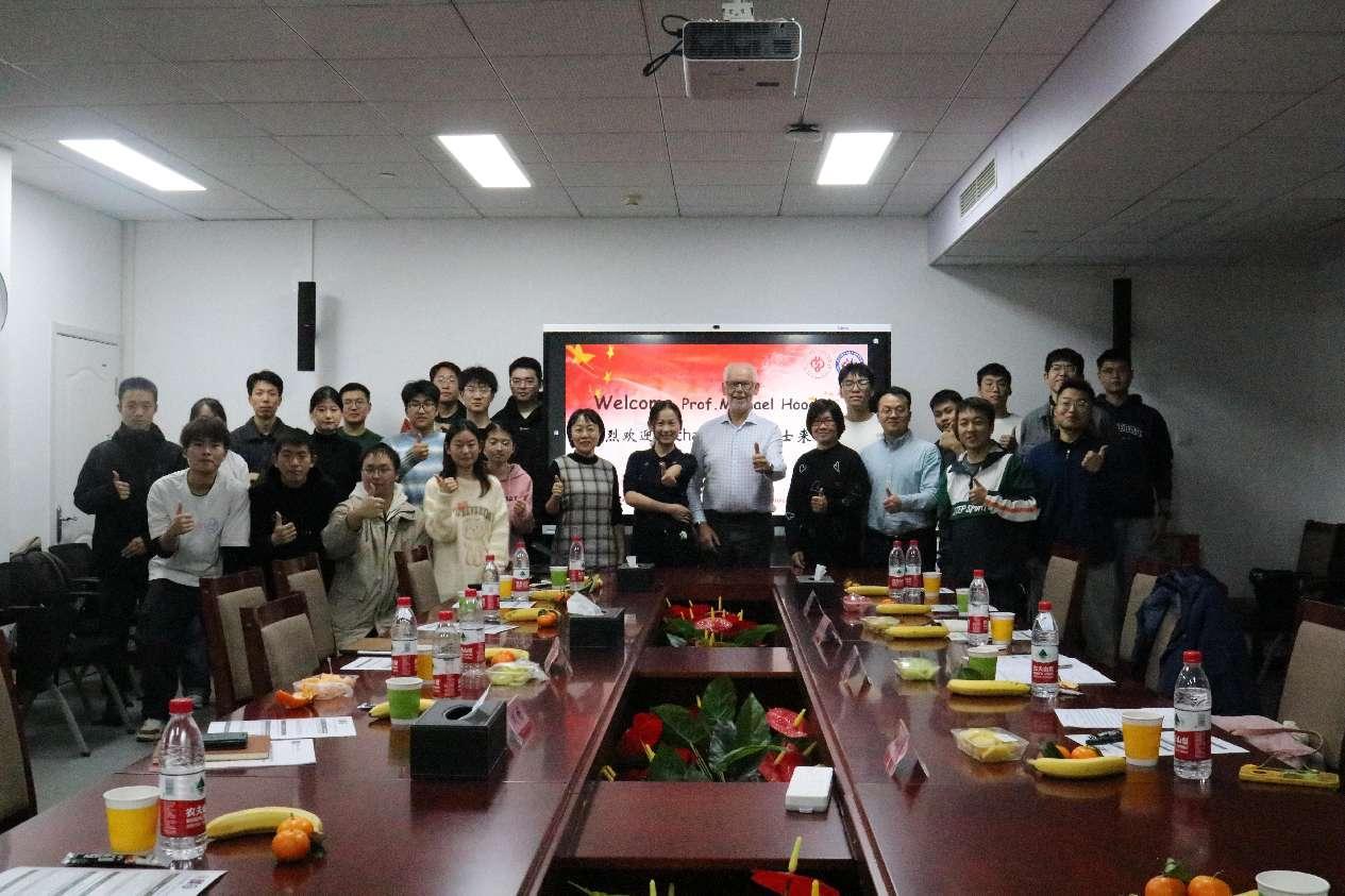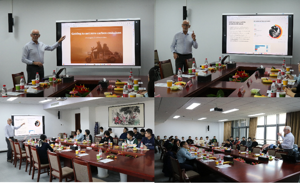 首先,Michael Hood院士在北校區主樓A1421為我校師生帶來題為“Getting to Net Zero Carbon Emissions”的學術報告會,由楊睿月副教授主持會議。Hood院士目前主要致力于CCUS理論與技術的研究,在此次研討會中,Hood院士詳細地介紹了實現凈零碳排放的意義、國際間的合作、氣候環境的挑戰、COP(締約方會議)結果與問題、非化石燃料電等內容,并與老師同學們進行了熱烈的交流互動。