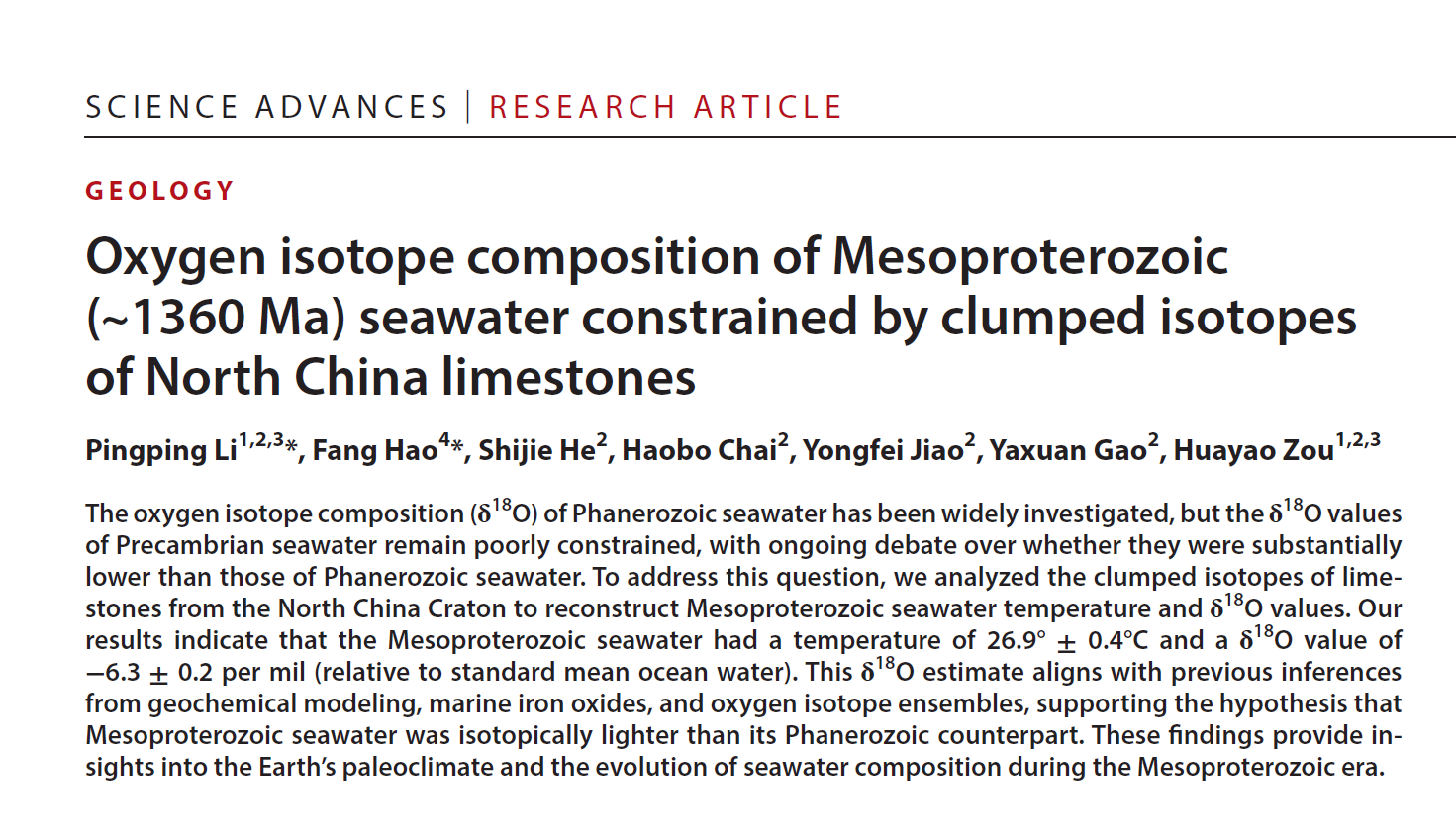 近日,油氣資源與工程全國重點實驗室李平平教授作為第一作者的學術論文“Oxygen isotope composition of Mesoproterozoic (~1360 Ma) seawater constrained by clumped isotopes of North China limestones”在《Science Advances》上正式發(fā)表。《Science Advances》是由美國科學促進會(AAAS)出版的綜合性自然科學期刊,是國際頂級期刊《Science》旗下的綜合性子刊,近5年影響因子為14.1。本論文由中國石油大學(北京)和中國石油大學(華東)聯(lián)合發(fā)表,中國石油大學(北京)油氣資源與工程全國重點實驗室為第一完成單位,通訊作者為李平平教授與郝芳院士。