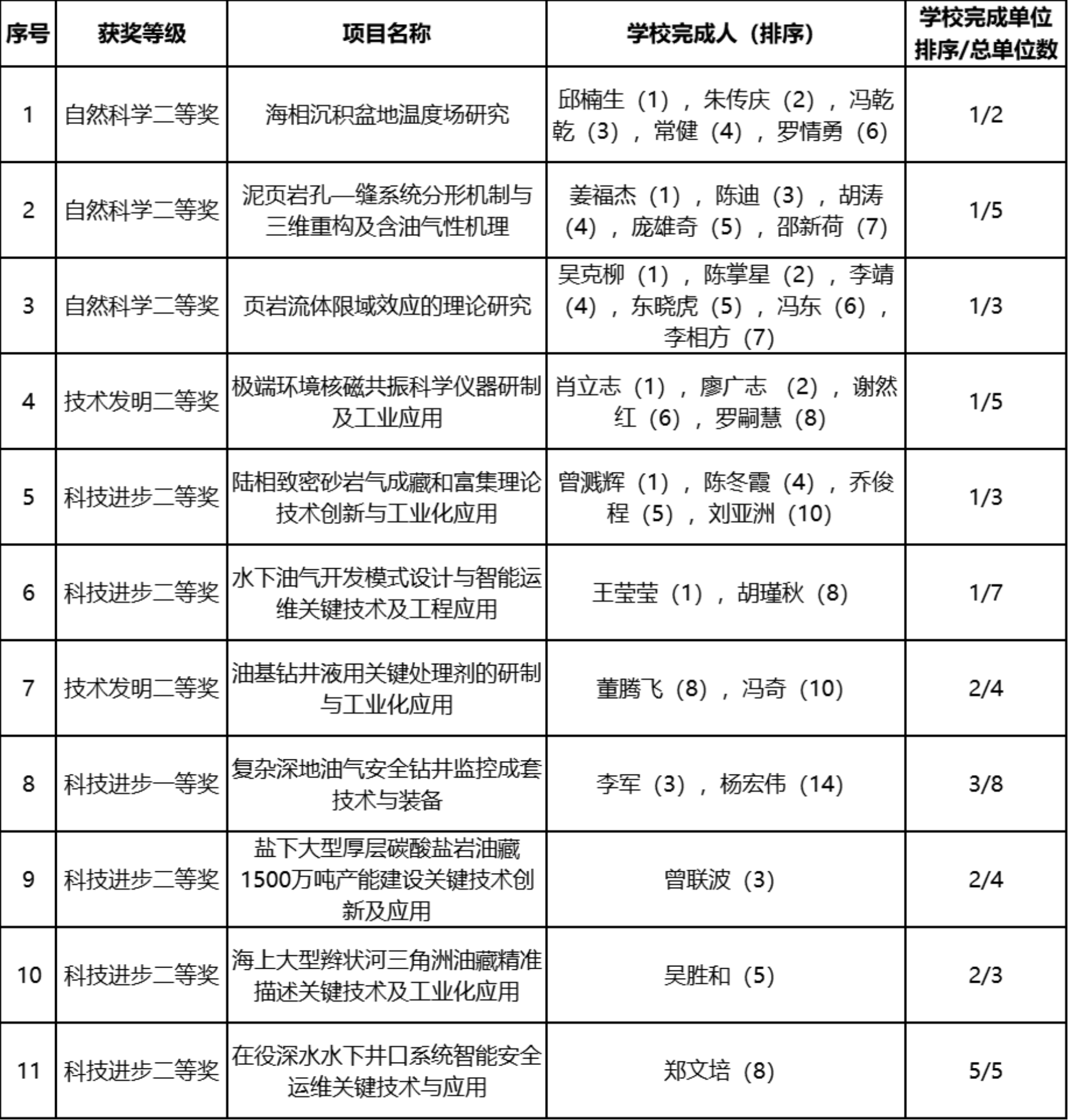 近日,北京市人民政府公布2022年度北京市科學技術獎勵決定,中國石油大學(北京)11項科技成果獲獎。其中實驗室教師9項科技成果獲獎,以學校為第一完成單位獲自然科學二等獎3項、技術發明二等獎1項、科技進步二等獎2項;以非第一完成單位獲科技進步一等獎1項、二等獎2項。