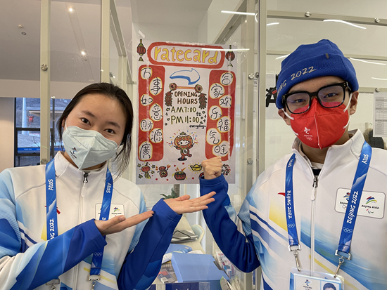 李茂粟工作的地點是收費卡服務臺,志愿者們每天都要面對來自各地的運動員。為了方便剛到冬奧村的代表團了解服務臺的工作時間,李茂粟謀劃著做個海報貼在窗口。因為正值新年,他覺得索性加入春節(jié)的元素,既有實用價值,還能兼具“傳遞中國傳統(tǒng)文化”的作用。