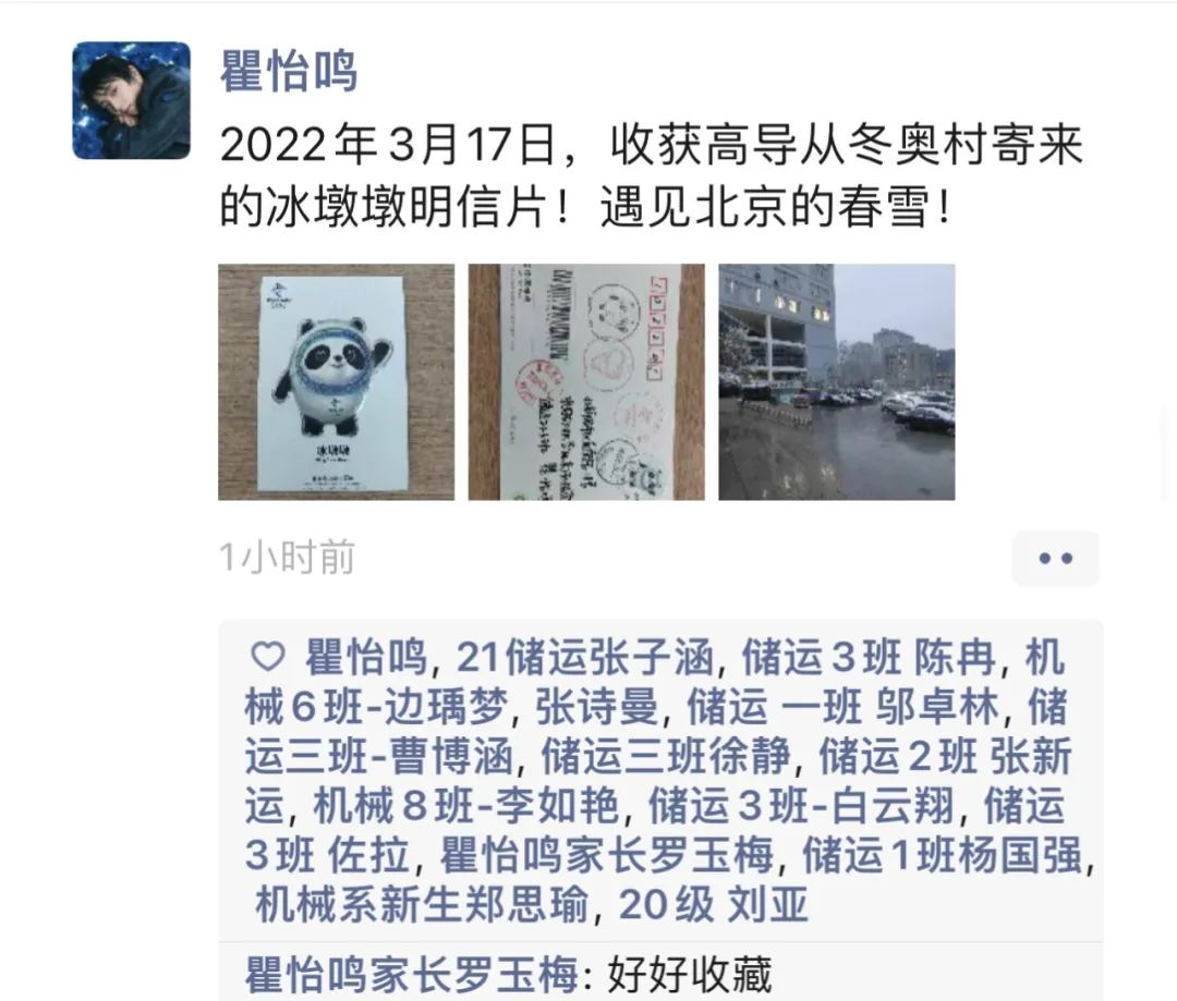 油氣儲運工程2021級本科生蔡文灝說,冰與春雪,雪和容融,百張明信片帶著冬奧的印記,跨越山海來到我們手中。冬奧村與中石大,冬奧志愿者和石大學子,導員和我們,這些不僅是一份掛念,更是一種緣分。冬奧已過,春雪降臨,疫情無法隔斷相連的心,我們牽手相約,一起向未來!
