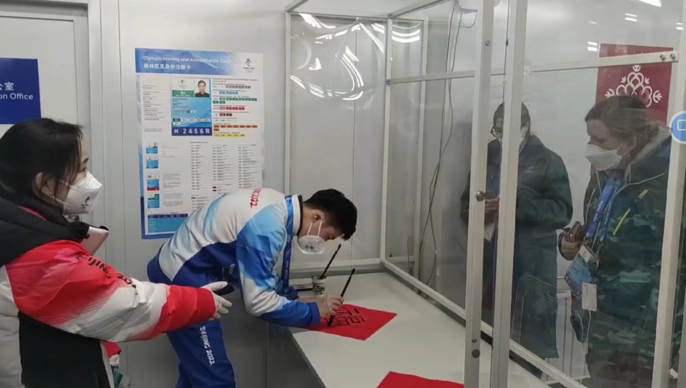 姜華瑀還記得,除夕當晚,延慶冬奧村注冊中心燈火通明,兩位澳大利亞代表團成員正在等候區等待班車,注冊領域副經理劉紫薇提議給身在異國的她們送上“中國福”。那天在崗的就有姜華瑀,他為外國友人寫了兩個“福”字,并解釋了福字的寓意以及貼法。