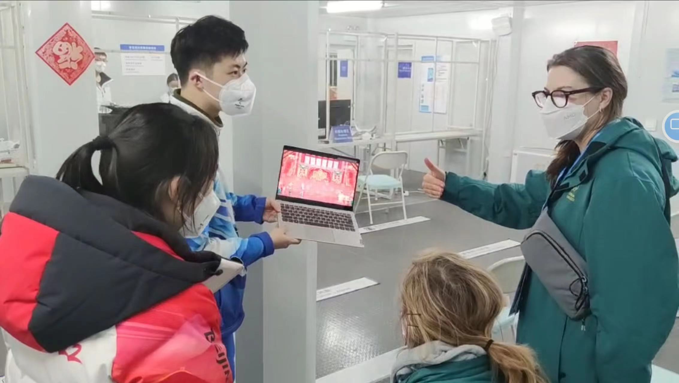 隨后,其他志愿者拿起電腦走了過去,介紹起中國春節聯歡晚會。外國友人饒有興致地看著黃梅戲、傳統京劇、現代京劇的聯排節目,并不斷提問:“這是直播嗎?”“這是有故事的嗎?”“這些故事有關聯嗎?”志愿者們一一為她們作出解答。“我們真的很喜歡中國的京劇,感謝你們送的福字,我們要把這些美麗的福字帶回去!”外國友人也很激動。