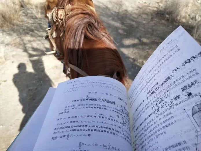 這是中國石油大學(北京)地球物理學院學生下力肯·對山汗的一張“自拍照”,照片中,他只有一個騎在馬背上的影子,占了畫面一半的是他的高等數學課本。