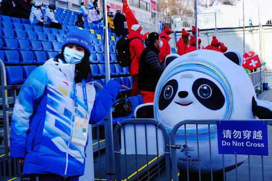 北京冬奧會志愿者徐天然在國家高山滑雪中心看臺區與冰墩墩合影。北京化工大學供圖