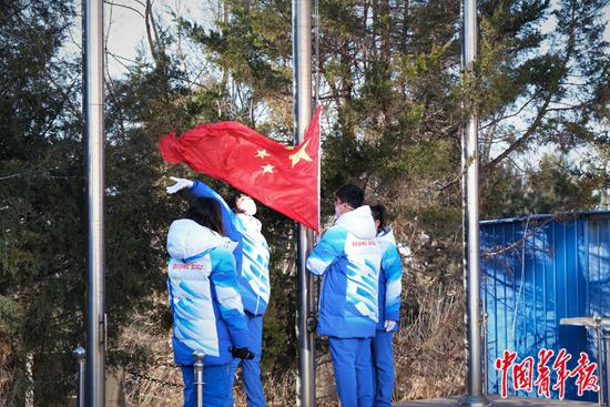 大年初一當天,北京冬奧會延慶賽區志愿者駐地舉行升國旗儀式。中青報·中青網見習記者 尹希寧/攝