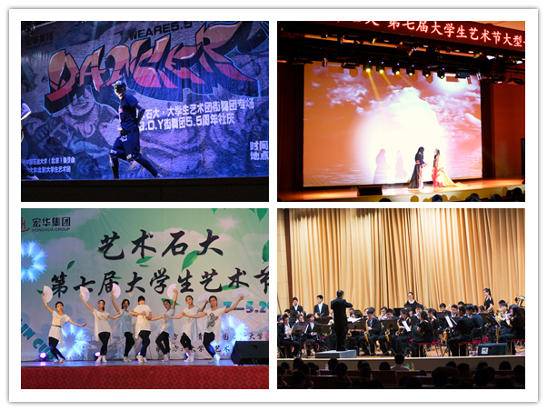 在民樂專場中,民樂團團員演奏了《阿細跳月》、《喜洋洋》、《花好月圓》等傳統器樂合奏,以及由團員們自己編排的《新賽馬》、《十年》等現代風格的樂曲,讓到場師生感受到濃濃的民族韻味。在舞蹈專場中,舞蹈團團員帶來了拉丁舞、新疆舞、佤族舞和傣族舞等多種風格的舞蹈和具有傳統特色的漢服秀,為觀眾帶來一場視覺盛宴。街舞專場中,街舞社的學生們展示了Poppin、Hiphop、Locking和Breaking四種類型的街舞表演,勁爆的音樂和高難度的動作讓現場氣氛異常熱烈。在朗誦專場中,朗誦團帶來的《霸王別姬》、《一如當初》、《與妻書》和《青春戀歌》等不同時代的音詩畫朗誦劇,充分調動起了現場觀眾的高漲情緒。合唱專場中,合唱團表演了《故鄉的云》、《送別》和《過去的明天》等不同風格的合唱曲目,展現了石大學子青春向上的精神風貌。話劇專場表演了大型話劇《空中花園懸賞聲明》,環環相扣的話劇情節和演員精湛的表演技術,展現了石大學子優秀的文學創作能力和話劇藝術表現能力。管樂專場中,管樂團演奏了大合奏《紅旗頌》、《春天的印象》、《加勒比海盜》,爵士樂《Amazing Grace》,弦樂《假如愛有天意》等曲目,為石大師生呈上了一場高水平的音樂會。本屆校園藝術節還邀請了國家一級演員尤泓斐通過現場講述與即興表演相結合的形式,為石大師生帶來了一場精彩的歌劇普及講座,為石大師生提供了“走近大師,感受經典,陶冶情操,提高修養”的良好機會。