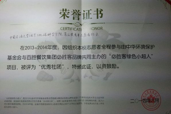 石大地球科學學院蒲公英青協獲得2013-2014年“必勝客綠色小超人”優秀團隊稱號