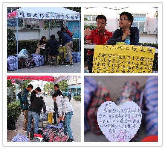 10月18日至22日,為踐行社會(huì)主義核心價(jià)值觀,建設(shè)服務(wù)型黨支部,深化學(xué)生黨員為人民服務(wù)的意識(shí),石大機(jī)械與儲(chǔ)運(yùn)工程學(xué)院本科2013黨支部開展了主題為“為阿里地區(qū)送溫暖”的愛心捐贈(zèng)活動(dòng),共收到捐贈(zèng)物品29大袋。