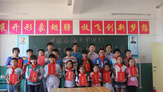 6月11日,中國石油大學(xué)(北京)地球物理與信息工程學(xué)院物探系黨支部驅(qū)車前往河北省大城縣大阜村鄉(xiāng)田莊小學(xué),開展“1+1理想的翅膀”長效助學(xué)系列活動。本次活動以物探系支部黨員捐助形成“物探勵志獎學(xué)金”,為大城縣4所小學(xué)中成績優(yōu)秀、表現(xiàn)突出的18位小學(xué)生頒發(fā)獎學(xué)金。