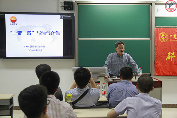 5月31日晚,中國石油天然氣集團公司國際部綜合處處長、高級經濟師陸如泉應邀做客石大第95期陽光講壇,在逸夫樓107教室為石大學生作了一場題為“‘一帶一路’與油氣合作”的主題講座。