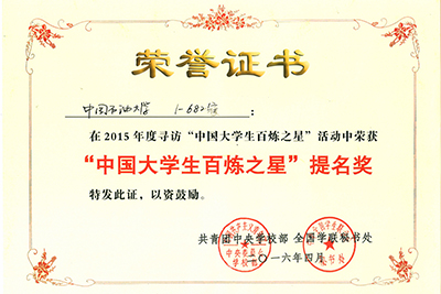 日前,由團中央學校部、全國學聯秘書處組織開展的2015年度尋訪“中國大學生百煉之星”活動結果揭曉。石大石油工程學院1-682宿舍榮獲2015年度“中國大學生百煉之星”提名獎。