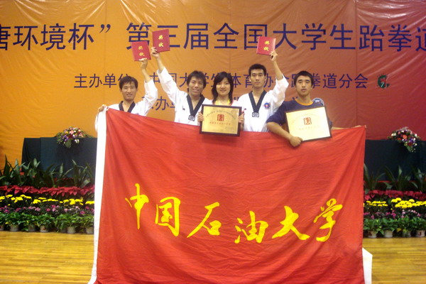 10月1日-- 5日由教育部、中國(guó)大學(xué)生體育協(xié)會(huì)組織的“第三屆全國(guó)大學(xué)生跆拳道錦標(biāo)賽”在華北電力大學(xué)舉行。此次比賽共有來(lái)自全國(guó)62所高校的719名選手參加,是歷年來(lái)的大學(xué)生比賽中參賽人數(shù)最多、水平最高、比賽規(guī)模最大的一次比賽。 本次比賽設(shè)競(jìng)技和品勢(shì)兩項(xiàng),品勢(shì)比賽以團(tuán)體形式進(jìn)行,每三人一組,男子共有23組,女子21組。我校跆拳道代表隊(duì)參加了高水平組﹑體育院校組和普通組的混合比賽,在比賽中不畏強(qiáng)手,沉著應(yīng)戰(zhàn),榮獲男子品勢(shì)團(tuán)體賽二等獎(jiǎng)的好成績(jī),并被大會(huì)組委會(huì)授予“體育道德風(fēng)尚獎(jiǎng)”。