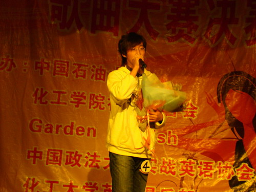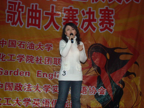 11月23日下午7點(diǎn),由我校化工學(xué)院社團(tuán)聯(lián)合會(huì)Garden English 協(xié)會(huì)主辦的第五屆三校英文歌曲大賽決賽在科學(xué)會(huì)堂舉行。經(jīng)過初賽和復(fù)賽,來自中國(guó)石油大學(xué),中國(guó)政法大學(xué),北京化工大學(xué)三所高校的12名選手在決賽中相遇。