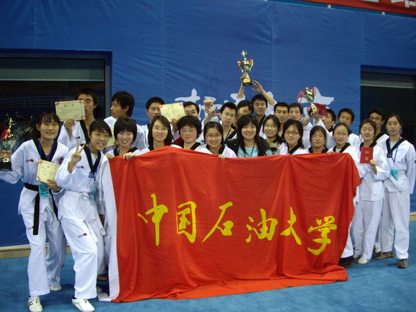 男子品勢(shì)團(tuán)體賽第一名:李誠(chéng)杰(數(shù)理系04級(jí))、劉濤然(資信學(xué)院05級(jí))、王帥(石工學(xué)院06級(jí))