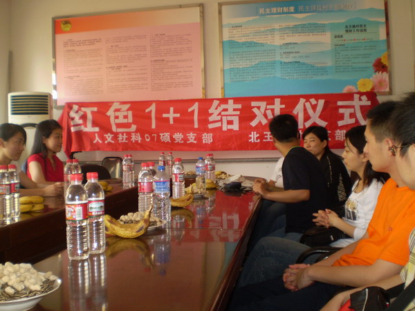 5月24日,在順義區北王路村黨支部,我校人文社科部07碩黨支部與北王路村黨支部開展了“紅色1+1”黨支部結對活動。