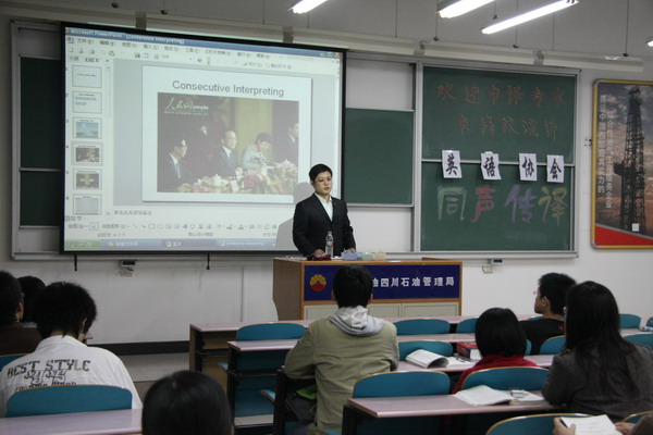 10月22日晚7點,由我校英語協會承辦,中國對外翻譯出版公司余洋老師主講的“同聲傳譯”講座在三教110教室舉行。