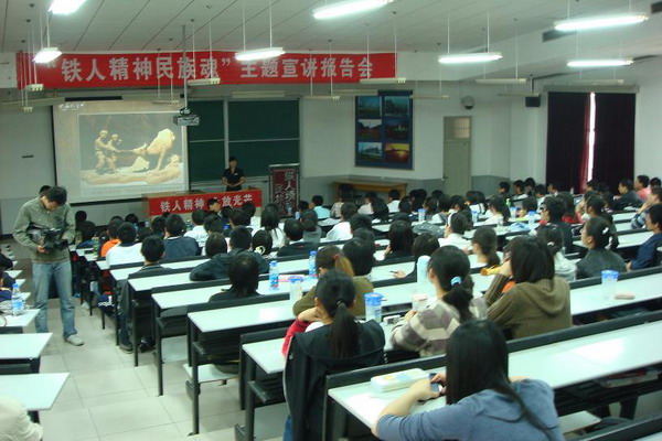 鐵人王進喜紀念館講解員田卓老師,通過由歷史照片、情景短片等制作的多媒體,分《不屈的童年》、《赤誠報國》、《艱苦創(chuàng)業(yè)》、《科學求實》、《無悔奉獻》、《鞠躬盡瘁》、《精神永存》七部分,展示了鐵人短暫而又不平凡的一生,歌頌了鐵人的英雄事跡,弘揚不朽的鐵人精神。報告會引起了師生的強烈共鳴,報告不時被熱烈的掌聲打斷,大家無不被“人拉肩扛運鉆機”、“破冰端水保開鉆”、“帶傷跳進泥漿池用身體攪拌泥漿壓井噴”等壯舉所震撼!
