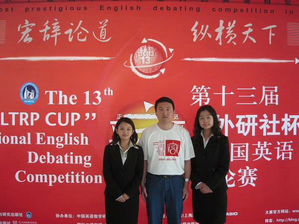 我校于2008年首次組隊參加“外研社杯”全國英語辯論賽,并取得了三等獎的好成績。在今年的校園選拔賽中,學校和外語系都對本次賽事給予了很大的重視與支持。外語系專門派出指導老師對選手進行專業培訓,學生會同學也積極地進行校園選拔賽的組織與宣傳。經過預選賽、初賽、決賽三輪嚴格的篩選,最后派出王珊與劉蒙蒙同學代表我校參加這項英語辯論界全國頂級賽事。外語系趙卿老師作為指導教師帶隊參加比賽。