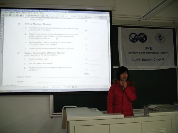 12月16日晚,由我校SPE學(xué)生分會(huì)組織的SPE論文大賽交流會(huì)在二教108成功舉行。本次活動(dòng)的主講人是石油天然氣工程學(xué)院油氣井工程專業(yè)07級(jí)碩士研究生何曉慶。
