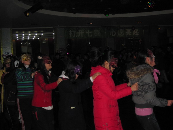 化妝舞會(huì)在一段由勁舞團(tuán)表演的動(dòng)感街舞中拉開序幕。隨后,在情意綿綿的音樂下,現(xiàn)場(chǎng)觀眾開始尋找與自己號(hào)碼相同的異性伙伴。可愛的圣誕老人為最快配對(duì)的5組同學(xué)送上了精美的禮物。之后,很多同學(xué)爭(zhēng)相上臺(tái)獻(xiàn)唱歌曲,而臺(tái)下的觀眾盡情的跳舞、暢聊、暢飲,舞會(huì)氣氛頓時(shí)推向高潮。在勁爆的音樂帶動(dòng)下,現(xiàn)場(chǎng)所有觀眾來到舞臺(tái)中央情不自禁的開始了近乎瘋狂的蹦迪,在動(dòng)感的音樂聲中放松著自己平日學(xué)習(xí)的緊張心情。最后,舞會(huì)在音樂《愛你》輕松愉悅的旋律中圓滿結(jié)束。