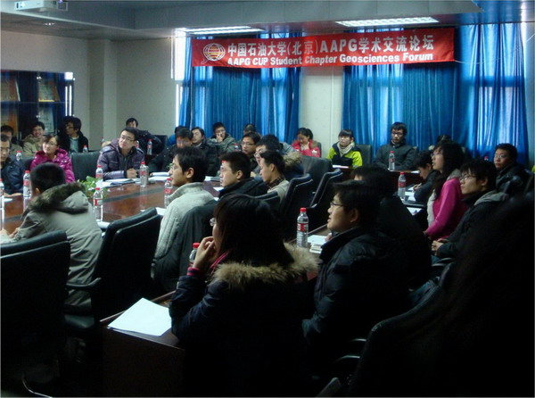2009年12月31日,在新綜合樓1103,我校與北京大學AAPG學生會成員濟濟一堂,由我校AAPG學生分會組織的以石油地質相關學科科學研究方法為主題的AAPG學術交流會在這里舉行。學術交流會由我校現任AAPG學生分會主席崔敏博士主持,我校研工部趙雄虎部長、資源與信息學院周子勇老師也應邀參加了本次學術會議。