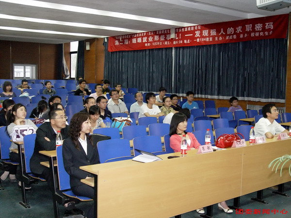 首先崔敏和周林波同學分別給大家講述了自己的求職經歷和求職技巧,與大家分享求職經驗。崔敏同學提出“沒有最好的單位,只有更適合自己的單位”的觀點,同時介紹了自己收集職業信息的方法,以及求職中可能面臨的問題及其解決方法。周林波同學則主要講述了面試方面的技巧和注意事項,指出要“硬件”,“軟件”兩手抓,即依靠成績單和臨場發揮兩者而取勝。