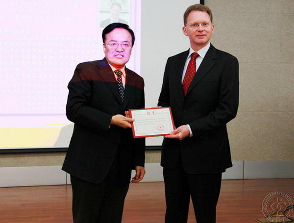 演講開始前,校長張來斌為Dirk Smit博士頒發兼職教授聘任證書并講話。他感謝Dirk Smit博士來校與師生面對面交流。他說,學校與各大石油企業有著良好的合作關系,在一些領域密切合作取得了可喜的成績,適逢國家提出未來十年教育改革和發展規劃綱要之際,石油大學將不斷地加強與石油企業的科技交流,努力推行國際化戰略和人才強校戰略,共同描繪學?!笆濉币巹澋暮陚ニ{圖。