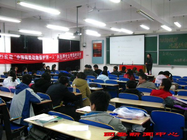 張呂萍女士以“生命沒有排序”為主題,圍繞“我們是誰”、“我們在做什么”等全面的介紹了她于1997年創建的北京人與動物環??破罩行牡母艣r以及他們為保護動物所做的努力。當講述到中國小動物生存環境之惡劣時,張女士表示希望大學生能積極投入到保護動物的行動中去,為動物保護事業貢獻自己的一份愛心。