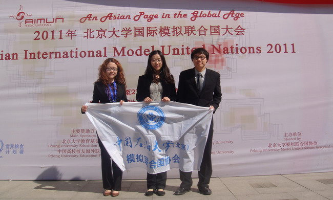 3月24日至3月27日,中國石油大學模擬聯合國協會派出3名代表參加了由北京大學舉辦的2011年國際模擬聯合國大會(AIMUN)。這次大會共有約400多名來自英國、美國、澳大利亞、新西蘭、新加坡、巴基斯坦、印度、印度尼西亞、南非等國家的高校和北京大學,外交學院、中山大學、西南政法大學等國內高校的大學生代表參加。