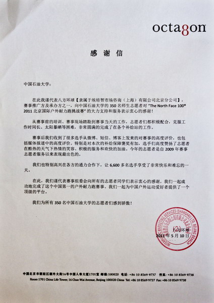 5月25日,作為“2011年北京國際戶外耐力跑挑戰賽”推廣方及承辦方之一的八方環球公司向中國石油大學發來感謝信,對350名志愿者在2011北京國際戶外耐力跑挑戰賽中優秀的志愿服務工作表示衷心的感謝。