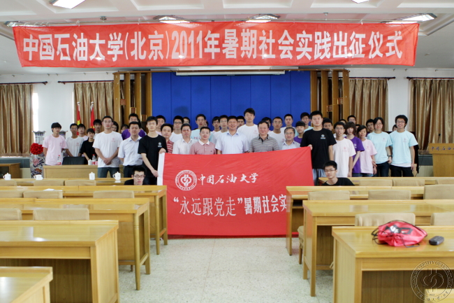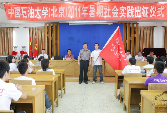 7月4日上午,中國石油大學2011年暑期社會實踐出征儀式在行政樓第四會議室舉行,校黨委副書記雷玉江、校長助理王國紅、團市委大學與中專工作部副部長孔毅出席了儀式,學生工作部、校團委和各院系學生工作負責人以及部分學生社會實踐團代表參加了儀式。