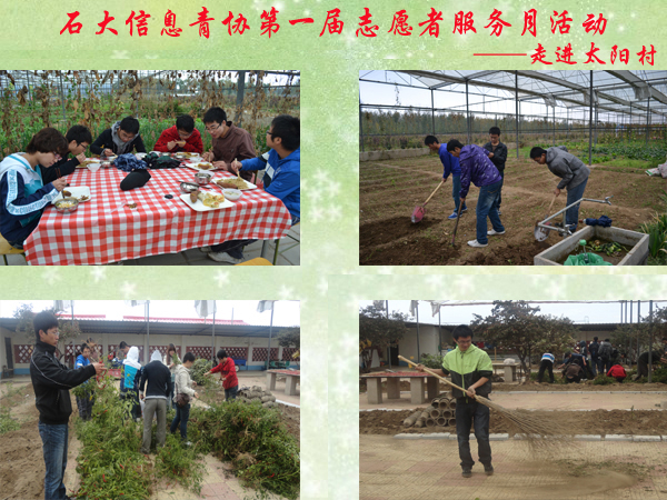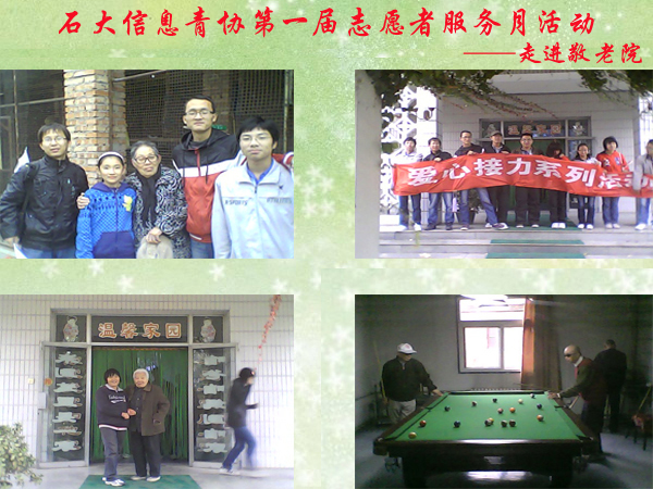 10月23日,石大信息學院青年志愿者協(xié)會攜手信息學院本09黨支部啟動了以“愛心接力,你我共行動”為主題的第一屆志愿者服務月系列活動。該系列活動由四個活動組成,分別為以“獻愛心,溫暖老人”為主題的走進愛地敬老院活動、以“關注兒童,托起明日的太陽”為主題的走進太陽村活動、以“傳遞愛心,需要你我”為主題的走進流村孤兒院活動、以“關注社區(qū)孤寡老人,共建和諧社會”的走進社區(qū)活動。