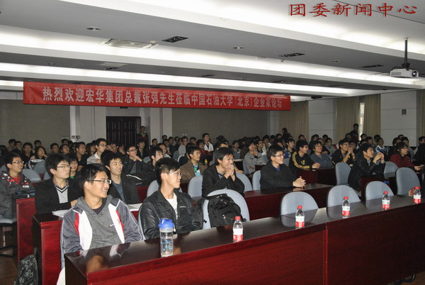 10月26日,由校團委主辦,校研究生會協辦,宏華集團總裁張弭受邀于國際交流中心三層報告廳為石大學子帶來了一場精彩的講座。宏華集團人力資源部總監馮尚飛、人力資源部經理吳彬也一并出席。