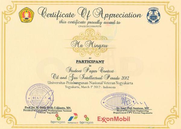 在OGIP2012系列活動中,中國石油大學2009級本科生馬銘勖同學提交的論文《A new study of china's advanced water-injection technology》榮獲Paper Contest鼓勵獎,2011級碩士生方百會、陳子劍、黃中良同學在Student Smart Competition表現優異,展示了石大學子扎實的專業知識和良好的精神風貌。活動期間,石大代表還參加了舉辦方組織的種樹、志愿服務當地幼兒園等活動。