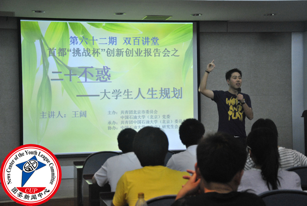 5月10日晚,在國際交流中心306,由共青團北京市委員會主辦的首都“挑戰杯”創新創業報告會邀請到職業規劃專家王闊作客中國石油大學第六十二期雙百講壇,為石大學子獻了一場精彩的大學生人生規劃講座。