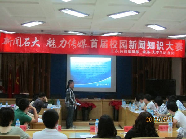 為進一步提高新聞媒體類社團的專業水平,增加石大學子的人文情懷,活躍校園文化氛圍,5月11日下午,由校報編輯部主辦,大學生記者團承辦的中國石油大學首屆校園新聞知識大賽在行政樓第四會議室圓滿落幕。比賽吸引了來自全校各個學院的新聞中心和記者團代表隊及校團委新聞中心、廣播臺等新聞媒體社團代表隊等共計12支隊伍參賽。