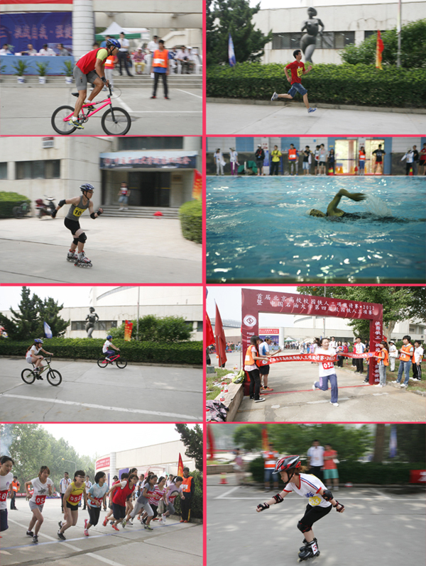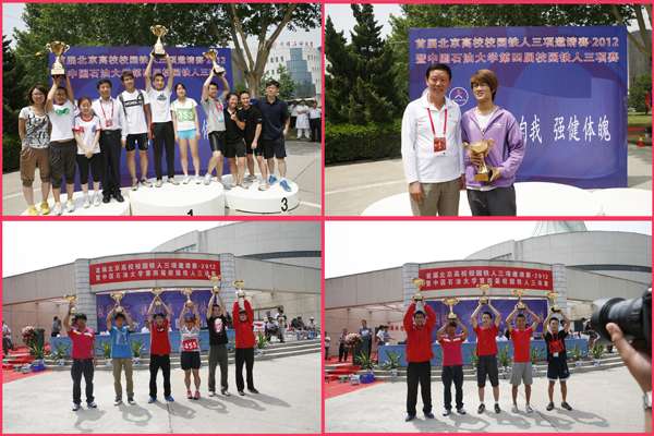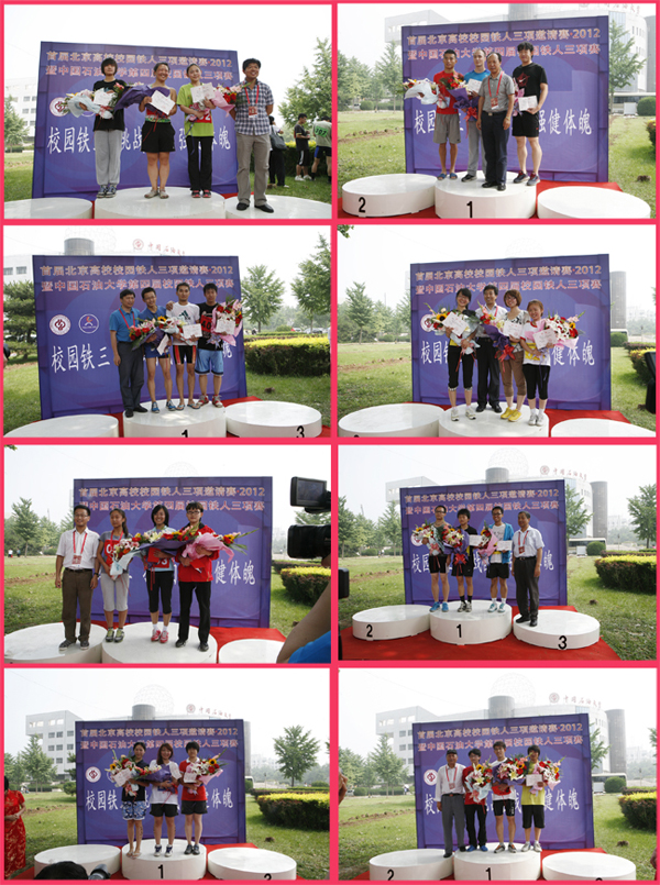 首屆北京高校校園鐵人三項(xiàng)邀請(qǐng)賽吸引了清華大學(xué)、北京大學(xué)、北京體育大學(xué)、北京林業(yè)大學(xué)、華北電力大學(xué)、中國(guó)農(nóng)業(yè)大學(xué)、中國(guó)政法大學(xué)、北京化工大學(xué)、北京農(nóng)學(xué)院、北京建工學(xué)院、中華女子學(xué)院、首都經(jīng)貿(mào)大學(xué)、北京工業(yè)職業(yè)技術(shù)學(xué)院、耿丹學(xué)院、中國(guó)石油大學(xué)(北京)15所北京高校的117名學(xué)生參賽。比賽設(shè)有男子組和女子組小輪車兩項(xiàng)、水陸兩項(xiàng)、滑輪兩項(xiàng)、小輪車三項(xiàng)、滑輪三項(xiàng)共10個(gè)項(xiàng)目,中國(guó)石油大學(xué)(北京)以絕對(duì)優(yōu)勢(shì)榮獲團(tuán)體總分第1名,北京大學(xué)、中華女子學(xué)院分別榮獲團(tuán)體總分第2名和第3名,其中6所高校榮獲“優(yōu)秀組織獎(jiǎng)”,清華大學(xué)榮獲“鐵人精神”獎(jiǎng)。