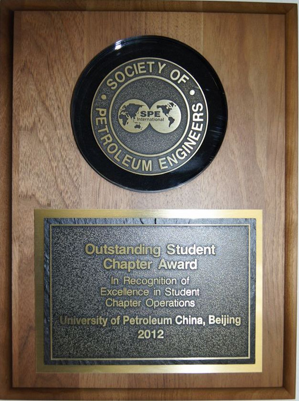 頒獎典禮上,全球SPE協會為石大SPE學生分會頒發學生分會最高榮譽“outstanding student chapter”。“Outstanding Student Chapter”用于獎勵國際上在活動舉辦、專業教育和規劃藍圖等方面表現優異的學生分會,是國際SPE組織授予SPE學生分會的最高榮譽。2012年度共有來自非洲、亞洲、歐洲、中東及北美等地的245個SPE學生分會參評該獎項,經過層層選拔,共有32個分會獲得“Gold Standard”殊榮,其中7個分會被授予“Outstanding Student Chapter”最高榮譽稱號。石大SPE學生分會繼2010年獲得“Gold Standard”稱號后繼續開拓創新,不斷突破,成為亞洲唯一獲得該獎項的分會。