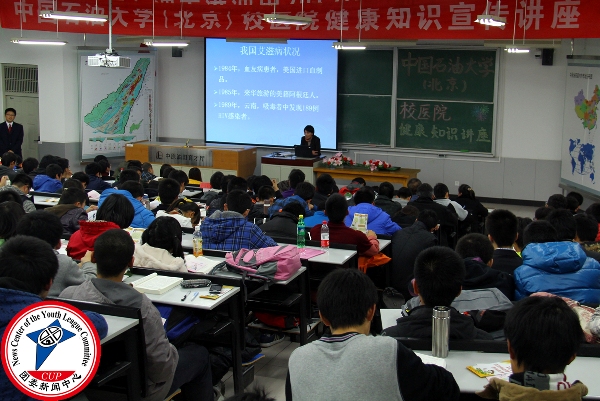 11月26日,由共青團(tuán)中國石油大學(xué)委員會及校醫(yī)院共同主辦,中國石油大學(xué)學(xué)生會承辦的健康知識講座在三教208舉行。本次講座由校醫(yī)院院長王永紅主講。結(jié)核病防治所工會主席何東寧,醫(yī)生谷亞瑩,以及艾滋病防治中心表代馬樹波等人應(yīng)邀參加了本次活動。