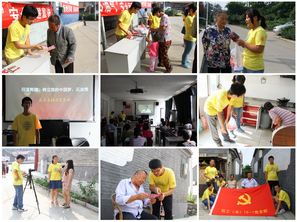 首先,同學們在胡莊村舉行了家用液化石油天然氣安全問題宣講,為村民講解如何安全使用液化石油天然氣,如何預防秋季感冒,如何防盜等問題,普及相關常識。然后,黨支部舉辦了“石油英模故事座談”、“回顧輝煌,樹立我的中國夢、石油情”專題講座,講述杰出石油英模事跡,組織觀看中國近十年所經歷的重大事件視頻節目。最后,同學們開展了“聽平凡夢、繪中國夢”和“走街串巷聽夢想”的采訪活動。