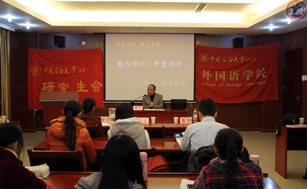 11月9日,中國石油大學在中油大廈311報告廳舉行第70期陽光講壇。原外交部非洲司司長、中國非洲合作論壇中方秘書長、中國駐摩洛哥大使程濤應邀為石大學子帶來了題為“魅力非洲,希望非洲”的講座.
