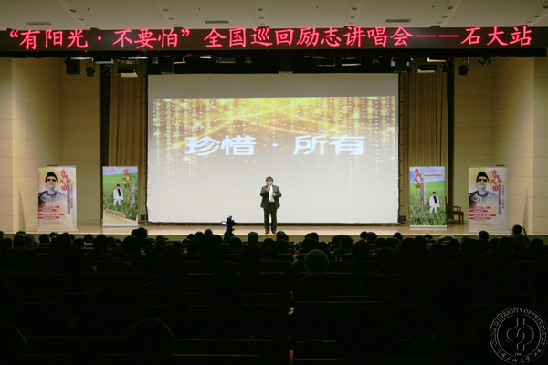 12月12日,“有陽光,不要怕”全國巡回勵志講唱會在石大中油大廈舉行,星光大道2007年度總冠軍、盲人歌手楊光做客陽光講壇,與700余名石大師生分享了自己的心路歷程。