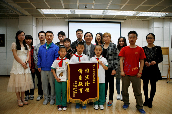 5月12日下午,石大陶笛社在音樂教室舉辦義務支教經驗交流會。昌平農民工子弟學校雨竹小學的師生們專程來學校為陶笛社送上了“惟宏隆德,情系教育”的錦旗。雨竹小學高秀芳代表雨竹全校師生,感謝陶笛社的同學們三年多來風雨無阻為學校的孩子們教授陶笛。她說:“陶笛增加了孩子們的自信,成就了他們的音樂夢想。三年多來,雨竹小學陶笛班的同學們參加了許多演出和活動,得到了社會、家長和許多公益組織的高度認可。三年多來,石大陶笛社的同學們雖然換了一批又一批,但是為雨竹小學的義務支教始終沒有停止,愛心接力一直在進行。現在,五年級的孩子們已經具備了一定的演奏水平,還準備參加今年夏天的全國陶笛比賽。”