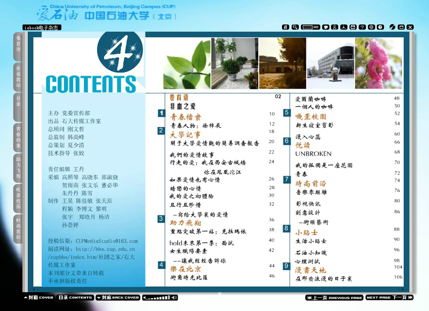 第四期《愛石油》會帶你擁有一次五彩紛呈的旅程——踏入“本科學術男”的世界;解剖大學愛情;分享過來人求職經驗;曬曬花哨的宿舍小窩;知曉徐克、杰倫干點啥;搜羅溫馨小店;發現喜歡的書……