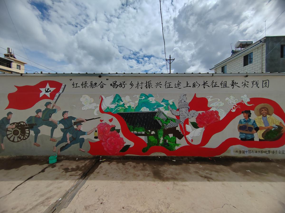 云南省楚雄彝族自治州南華縣是學(xué)校定點(diǎn)幫扶縣,在沙橋鎮(zhèn),實(shí)踐團(tuán)來到紅軍長(zhǎng)征過沙橋紀(jì)念館,體會(huì)“五嶺逶迤騰細(xì)浪,烏蒙磅礴走泥丸”的革命精神;在羅武莊鄉(xiāng),實(shí)踐團(tuán)深入調(diào)研“一棵煙”“一棵草”“一棵菜“一棵花”“一頭牛”的集體經(jīng)濟(jì)模式和富民產(chǎn)業(yè)發(fā)展?fàn)顩r;在龍川鎮(zhèn),實(shí)踐團(tuán)來到海子山社區(qū)進(jìn)行“和美鄉(xiāng)村”建設(shè),將長(zhǎng)征精神和鄉(xiāng)土文化等內(nèi)容以漫畫的形式繪到墻面,在美化鄉(xiāng)村街道環(huán)境的同時(shí),提振農(nóng)民精氣神;在思源實(shí)驗(yàn)學(xué)校,實(shí)踐團(tuán)成員們圍繞紅色精神、非遺傳承、綠色科普、青少年心理健康教育等主題開展了多彩暑期課堂,實(shí)踐團(tuán)成員中的“一起云支教”活動(dòng)志愿者還帶領(lǐng)孩子們編排錄制《長(zhǎng)征組歌》節(jié)目,制作了長(zhǎng)征主題特色紙漿畫作品。